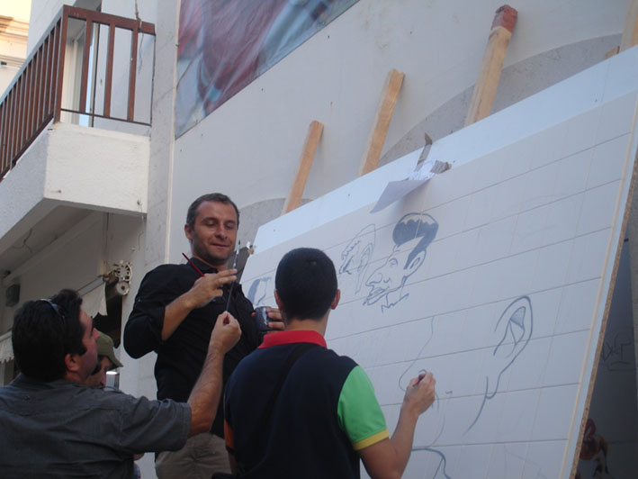 Foram vários os colegas de profissão do Francisco Zambujal, que participaram na pintura do painel. Não foram assim tantos, foram 4. O Carlos Laranjeira e o Ricardo Galvão, dois sucessores directos do Mestre Zambujal na imprensa desportiva, o Fernando Madeira (cartonista de Faro) e eu.